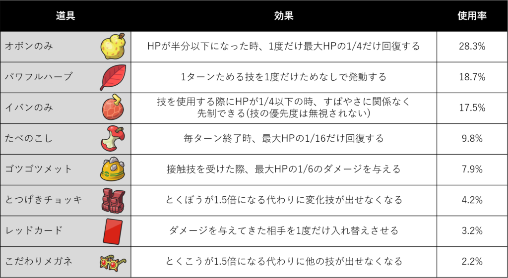 対戦でよく使われるメジャーな道具、特にきあいのタスキ、いのちのたま、オボンの実などは汎用性が広く、雑に持たせることができます。