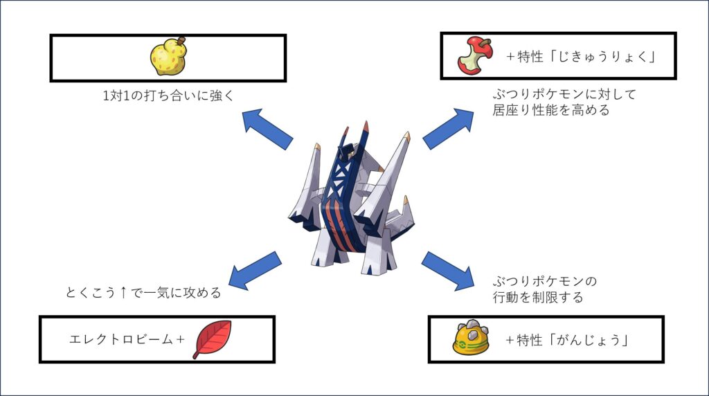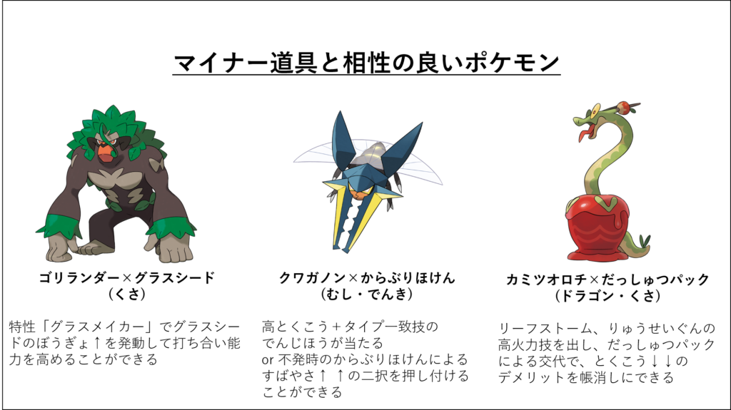 ・道具が変わればポケモンの役割も変わり、多様な道具と相性の良いことはバトルにおいて強みとなる