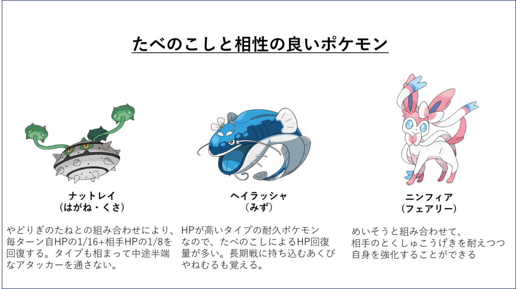そのため、たべのこしを持たせることによって、高い耐久力と回復を活かした長期戦に持ち込み、相手をじわじわ攻める戦法をとることができます。