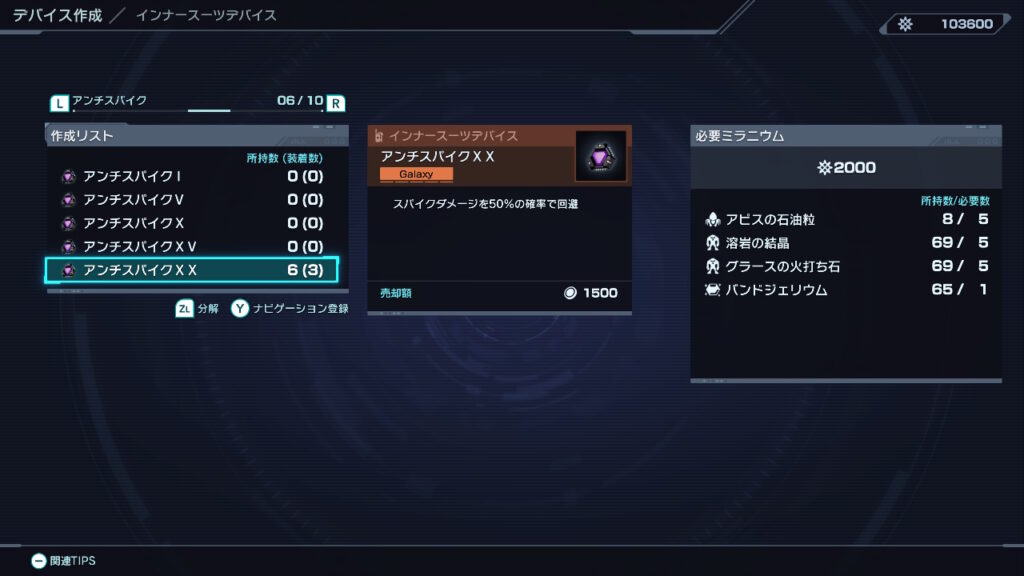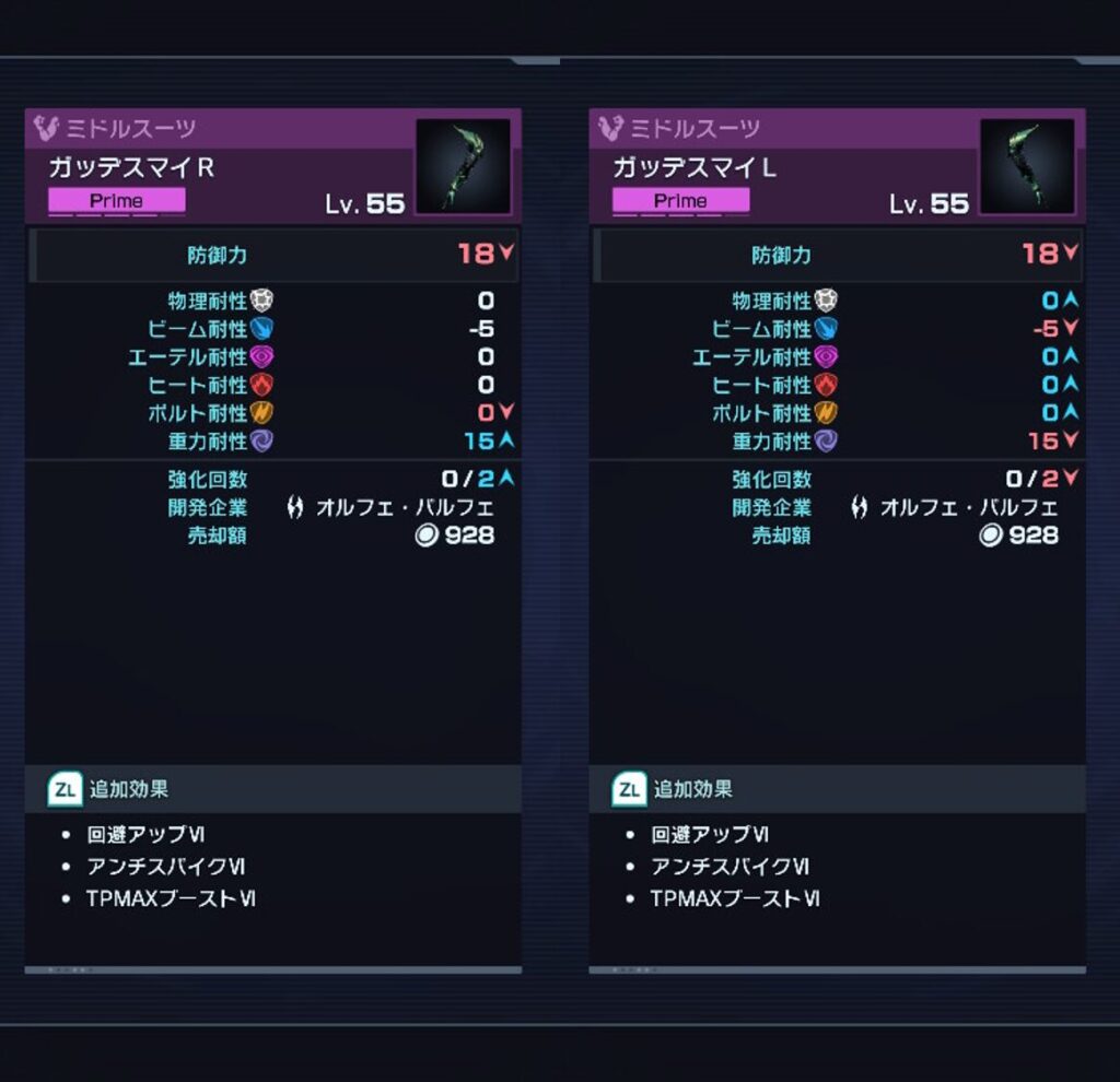 ですのでフェイクボディや高い回避力、属性耐性などにより防ぐことが必要です。味方キャラの装備については、ショップで購入できるオルフェ・パルフェのインナースーツ(右腕/左腕)がおすすめです。重力耐性と回避アップのアフィックスがあるだけでなく、後述するアンチスパイクがついているため、戦闘不能になりにくくなります。