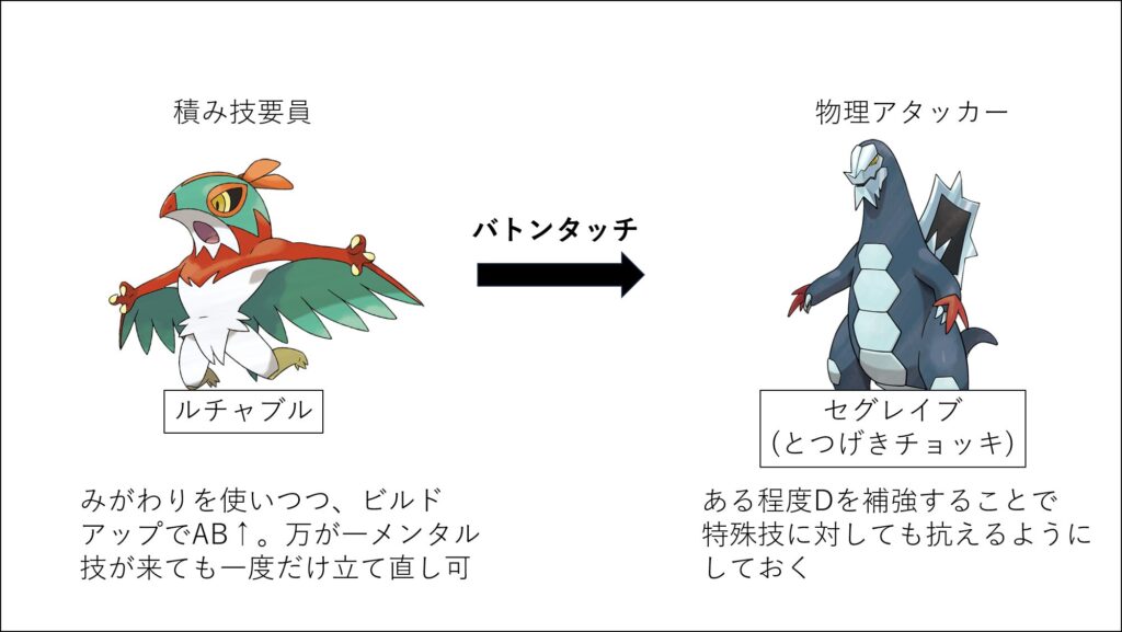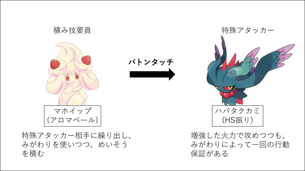 後続のアタッカーに対して行動保証を生み出す。特にビルドアップ/めいそう/ちょうのまいなど耐久を上げつつ火力を伸ばす変化技(積み技)を使用し、相手が2回以上攻撃を当てないとみがわりが解除されない状況で後続のアタッカーへつなげるのが理想。