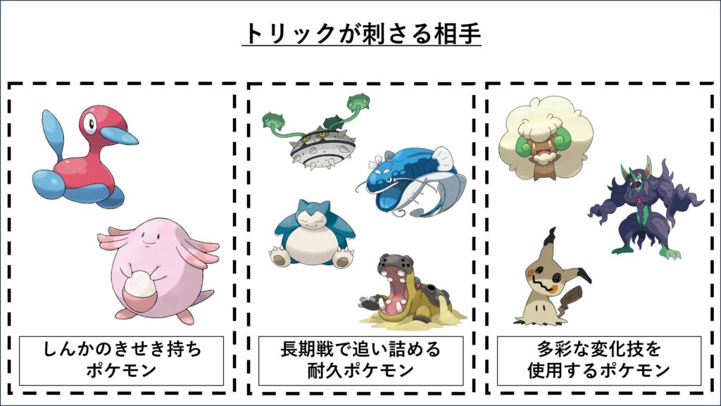 そのポケモンの強さが持ち物前提のものであったり、特定の持ち物と相性の悪いポケモンに対してトリックを使用することで大きく弱体化させ、バトルを有利を進めることができます。
