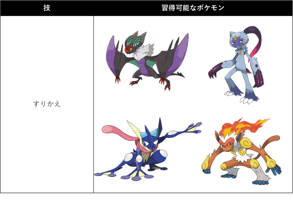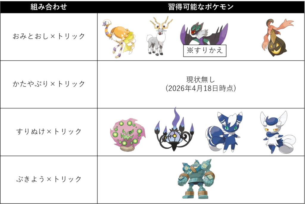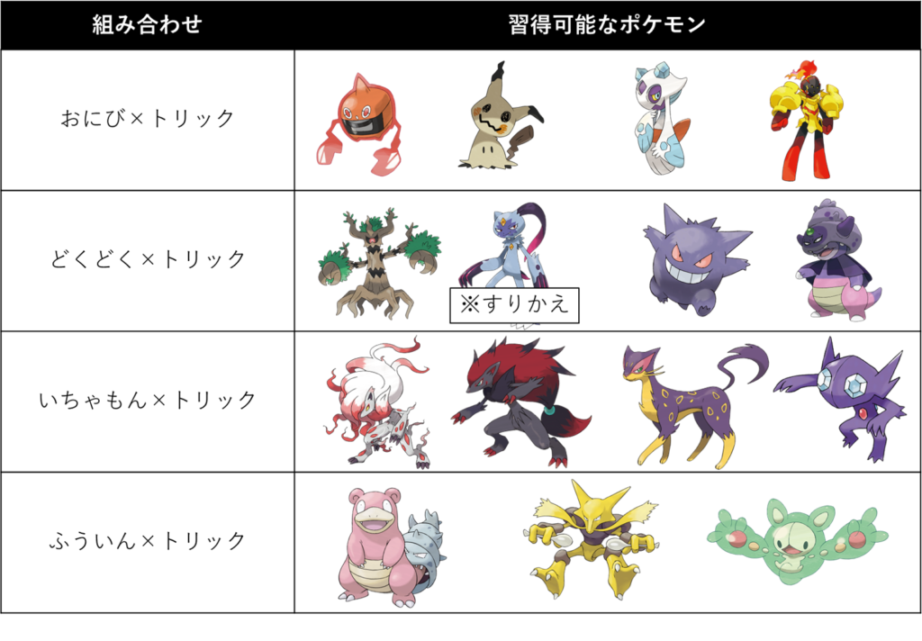 また、トリックはエスパータイプの技により悪タイプ持ちに無効化されますが、すりかえは悪タイプなのでタイプ相性で無効化されません。したがってすりかえはトリックの上位互換技であり、すりかえを覚えることができるのであれば、すりかえを採用するのがおすすめです。