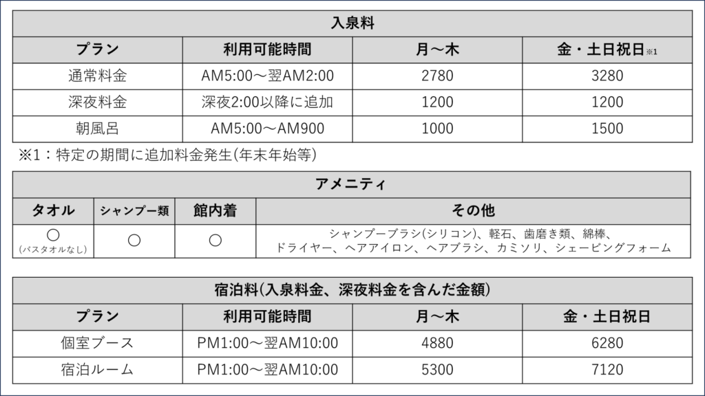 入泉料、アメニティ類、宿泊費は下記の通りになっています。