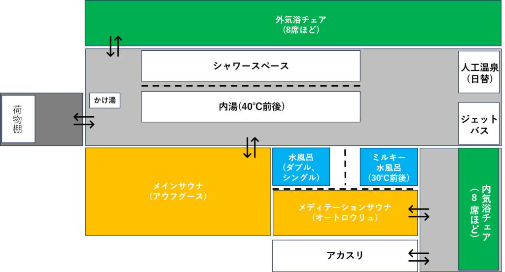それでは大浴場に入っていきます。大浴場での各設備の配置は下図の通り