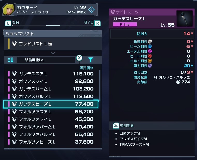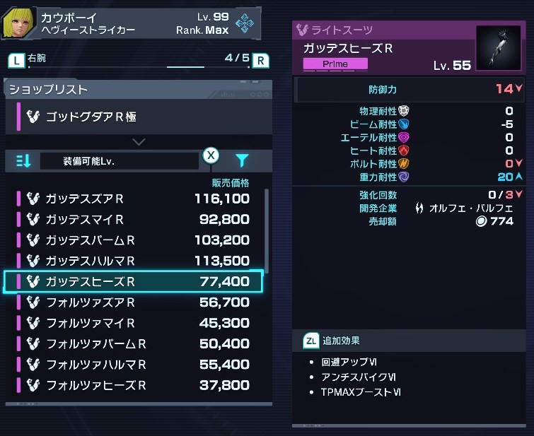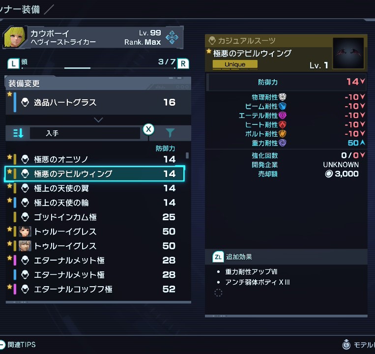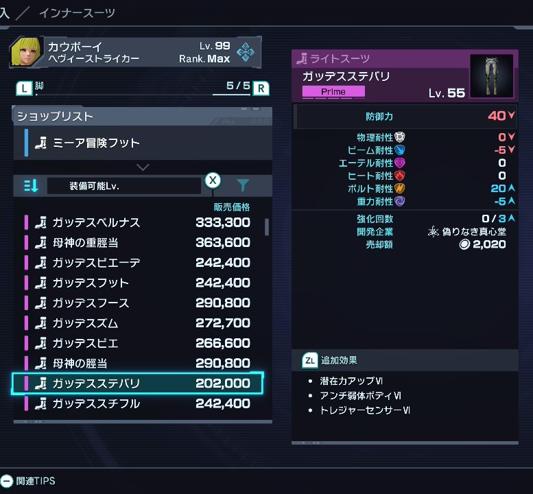 潜在力アップはデバイスで外付け可能だが、ドロップ産も含めて胴/左腕/右腕/脚において、素で潜在力を上げられるのは真心堂のショップ装備のみである。