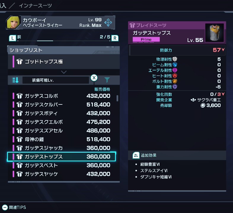 一方でショップやクエストで入手できるインナースーツはアフィックスが固定であるものの、ドロップ産の抽選テーブルには存在しないアフィックスがついているものもあります。先ほどのトップスシリーズだとショップ産のアフィックスは経験値豊富、ステルスアイ、ダブルリキャ短縮です。これはドロップ産では絶対に付かないアフィックスです。