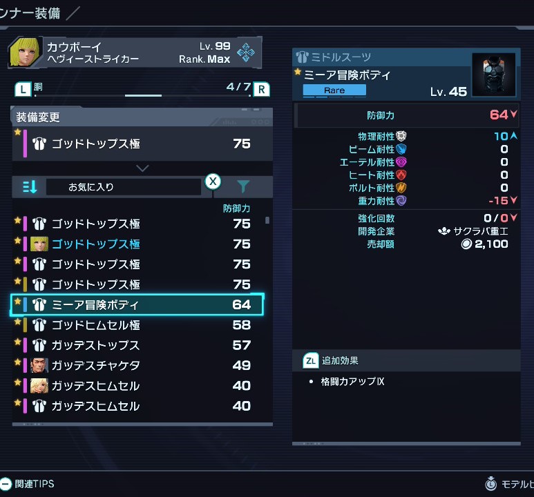 格闘力アップがつく胴装備の中では最もアフィックスのランクが高い。Ⅸほどであれば優先度はそこまで高くないが、少しでも格闘力を上げたいならおすすめ。