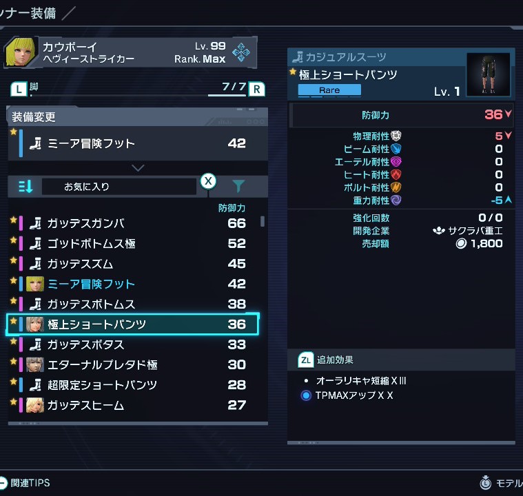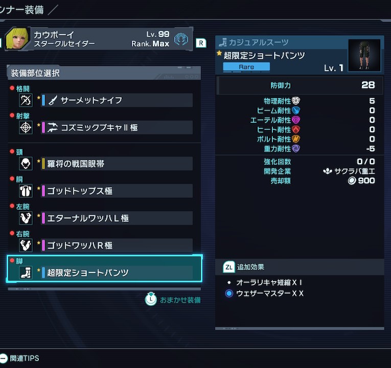脚装備でオーラリキャ短縮が付くのはショートパンツシリーズのみ。最高ランクは極上だが、超限定も十分有用。少しでもアーツリキャストを短縮させたい。