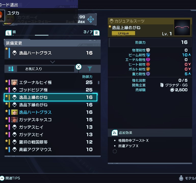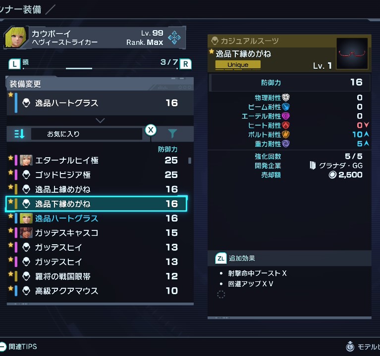 逸品上緑メガネ:格闘命中ブーストⅩ、回避アップⅩ